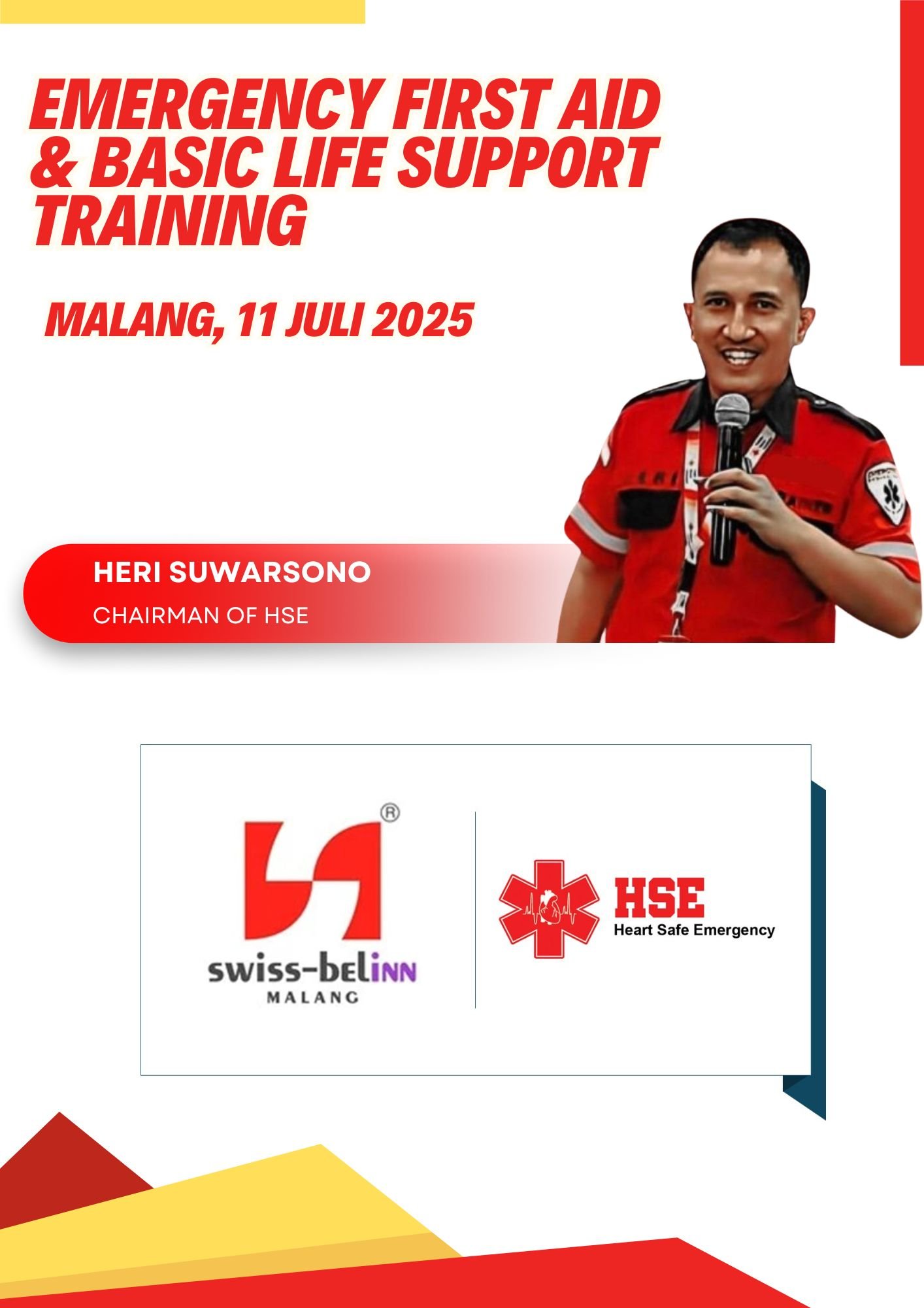 Acara ini menghadirkan pemateri utama, Chairman of HSE, Bapak Heri Suwarsono, yang membawakan materi secara interaktif dan aplikatif. Dalam penyampaiannya, beliau menekankan pentingnya kecepatan, ketepatan, dan ketenangan dalam menangani situasi darurat, baik di lingkungan kerja maupun masyarakat.