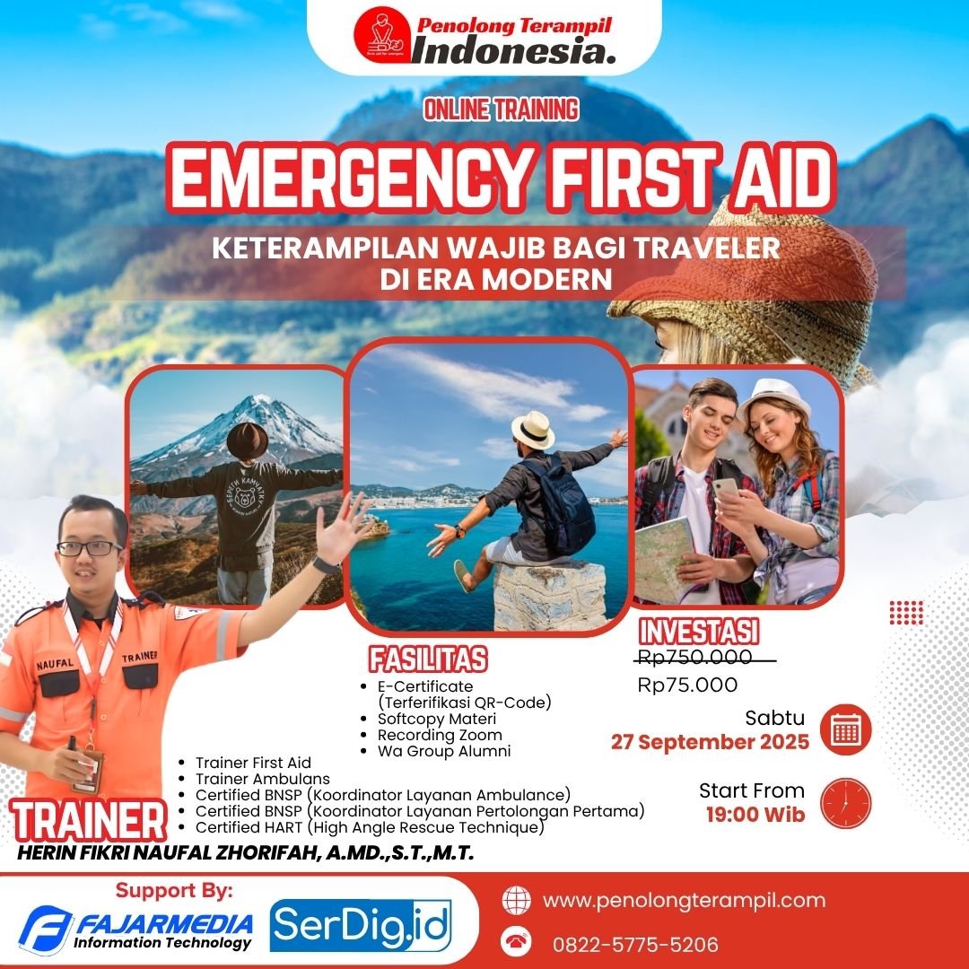Pada Sabtu, 27 September 2025 telah dilaksanakan Online Training Emergency First Aid: Keterampilan Wajib Bagi Traveler Di Era Modern yang diikuti oleh peserta dari berbagai kalangan. Kegiatan ini menghadirkan pemateri Herin Fikri Naufal Zhorifah, A.MD., S.T, M.T., seorang trainer yang berpengalaman dan tersertifikasi dalam bidang First Aid, Ambulance Training dan HART (High Angle Rescue Training).