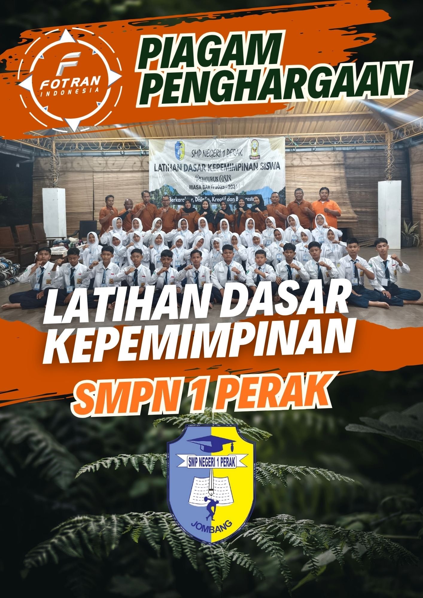 Wonosalam, 16 – 17 Oktober 2025 — SMP Negeri 1 Perak sukses melaksanakan kegiatan Latihan Dasar Kepemimpinan (LDK) pada tanggal 16–17 Oktober 2025 di Agropolis, Wonosalam. Kegiatan ini merupakan hasil kolaborasi antara SMPN 1 Perak dengan Fotran Indonesia yang bertujuan untuk menumbuhkan jiwa kepemimpinan, tanggung jawab, dan kedisiplinan di kalangan peserta didik.