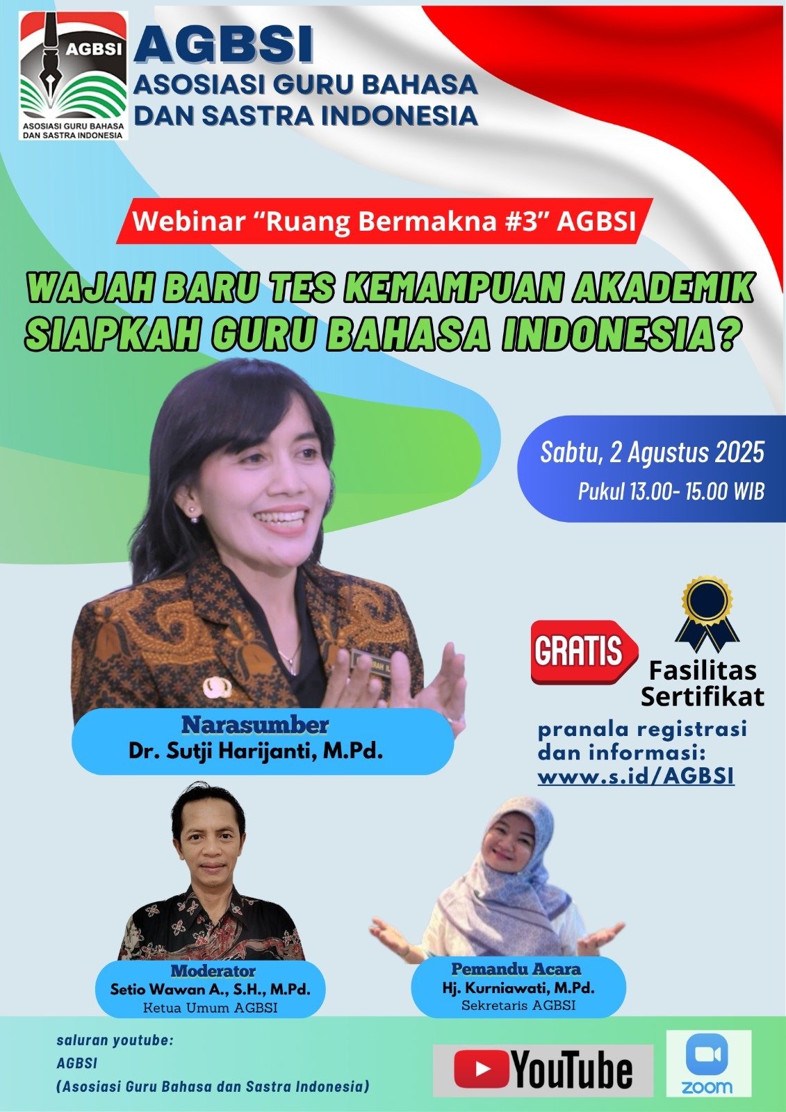 Asosiasi Guru Bahasa dan Sastra Indonesia (AGBSI) sukses menyelenggarakan Webinar “Ruang Bermakna #3” yang kali ini mengangkat tema “Wajah Baru Tes Kemampuan Akademik” bagi para pendidik dan pemerhati pendidikan. Webinar ini diselenggarakan secara daring pada Sabtu, 2 Agustus 2025, pukul 13.00–15.00 WIB.