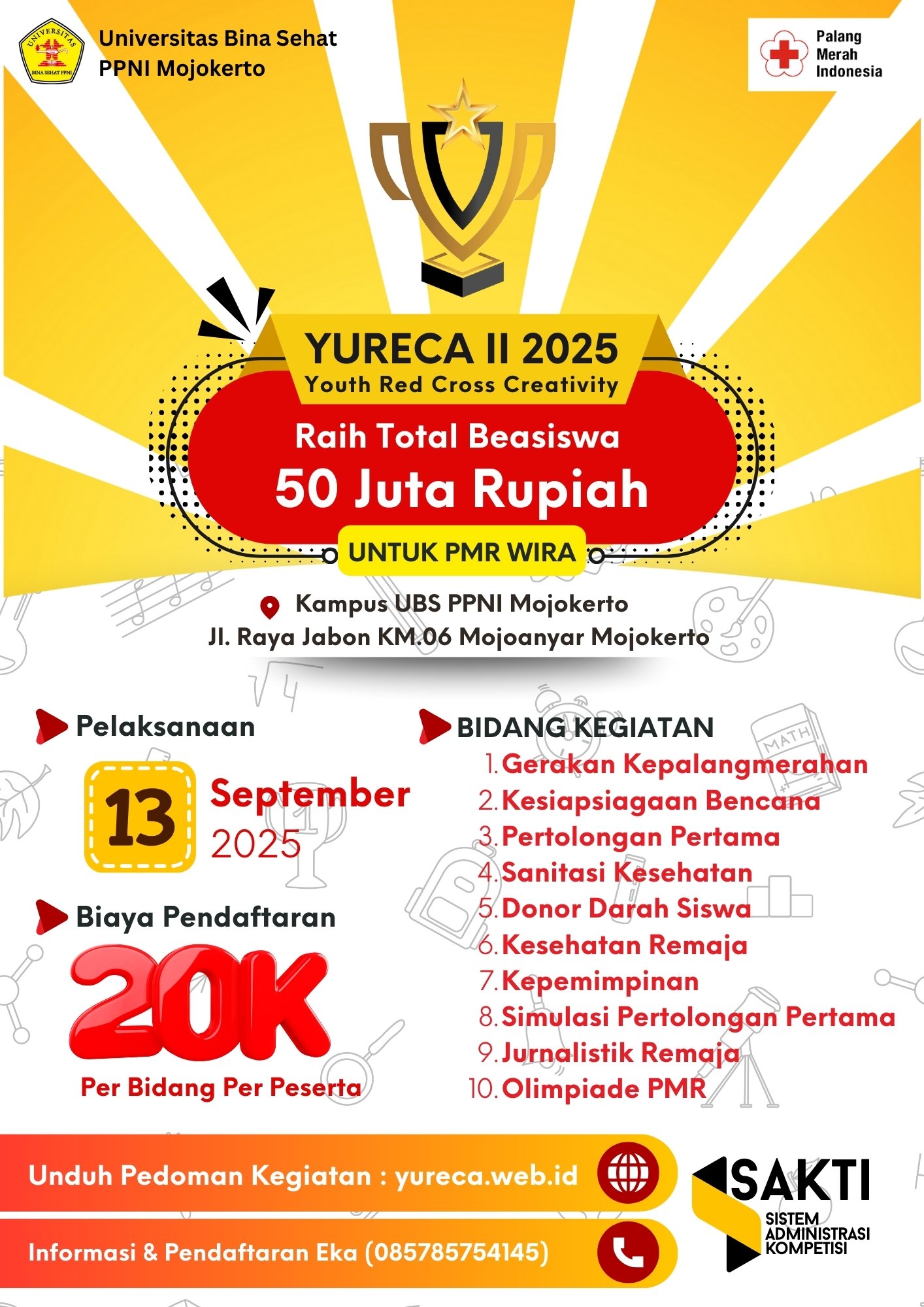 Mojokerto, 13 September 2025 – Sebagai bentuk dukungan terhadap pembinaan generasi muda yang berkarakter, sehat, dan peduli kemanusiaan, salah satu kampus swasta di Mojokerto menyelenggarakan Lomba Palang Merah Remaja (PMR) Tingkat Propinsi pada Sabtu (13/9/2025). Ajang yang disebut dengan tajuk YURECA (Youth Red Cross Creativity) Competition II – 2025, merupakan lomba ajang kompetisi yang diselenggarakan oleh Universitas Bina Sehat (UBS) – PPNI Mojokerto bekerja sama dengan Palang Merah Indonesia (PMI). Lomba yang terbagi dalam 10 bidang lomba ini, bertujuan untuk meningkatkan kemampuan anggota PMR, mempererat tali silaturahmi antar anggota, serta menumbuhkan semangat kepalangmerahan.